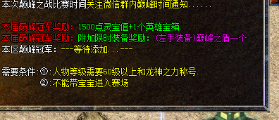 进入条件:等级满60级以上,需开龙神之力。进入巅峰等候室后,不能回城。